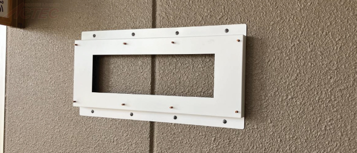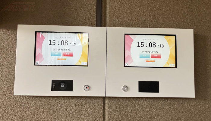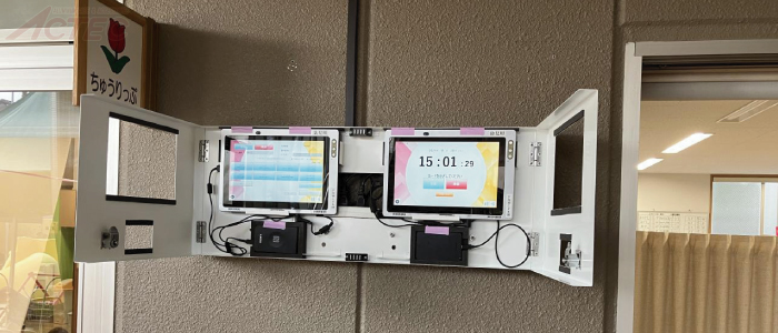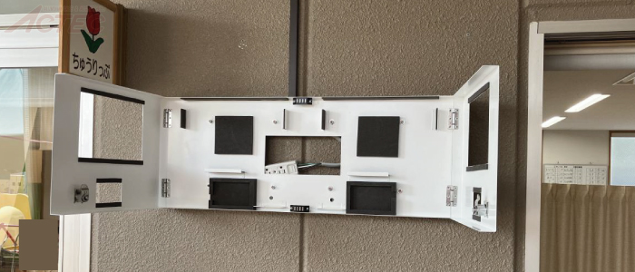 登降園管理システムを用のタブレットPCとカードリーダーを壁面に設置する板金ケース。