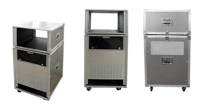 2段重ねのコンテナ・ラックケースです。下段と上段をフックでつなげているので、フックを外せば別々のアルミケースてしても使用できます。下段はキャスター付き。どちらも埋め込み型バネ手です。