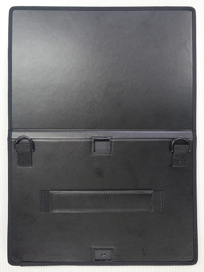 タブレットケース背面の写真。ショルダーベルト取付用のDカンが2個縫いつけています。 手を通す背バンドが付いていおり、端末を保持するのが容易になります。