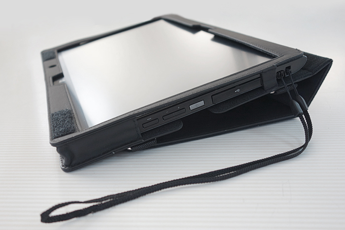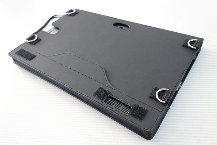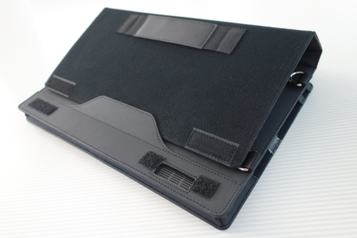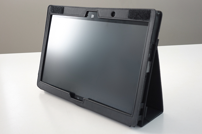 保護用の蓋を背面に折り返して固定することで、傾斜を付けてタブレットを使用できます。