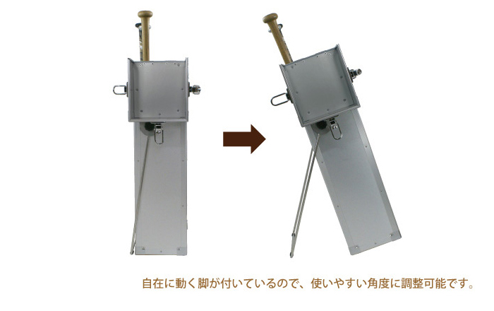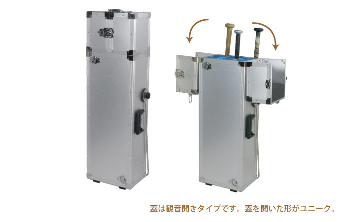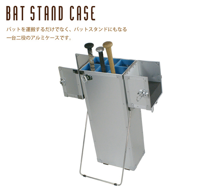 バットを運搬するだけでなく、バットスタンドにもなる一台二役のアルミケースです。 自在に動く脚が付いているので、使いやすい角度に調整可能です。