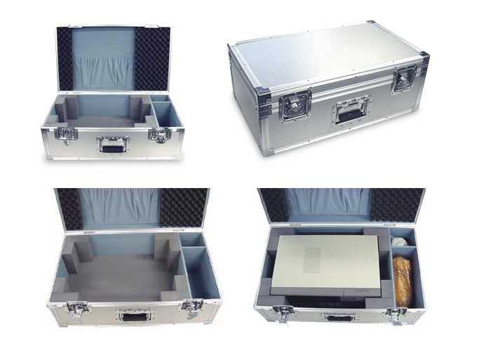 前は埋め込みロータリー錠、把手は埋め込み式のバネ手になっています。 固定仕切りで本体と付属品の収納スペースをくぎり、本体収納スペースは硬質ウレタン(A-8)をコーナーにL字に配置しています。