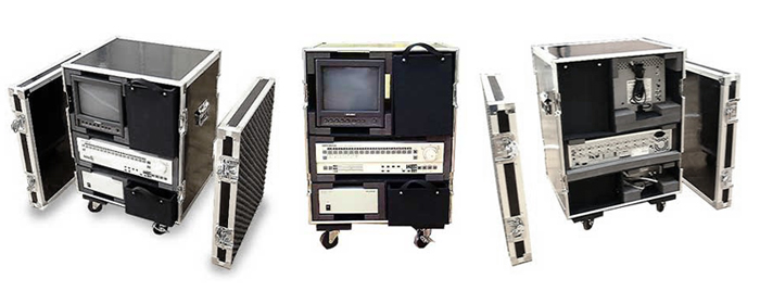 パネルにFRP(ブラック)を使用したアルミケース。前後面両開き式で、蓋に波型ウレタンを付けています。 内装はラックを取りつけて、硬質ウレタンをコの字型にして機材を入れています。2ヶ所に引き出しを取り付けました。
