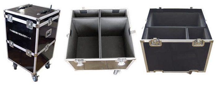 外観パネルはFRP板を使用したアルミケース。2段式で、上段と下段のつなぎは埋め込みロータリー錠で固定。 天面はベルト付きで、表面にシルク印刷をしています。