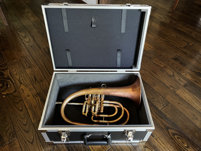 フリューゲルホルン用のアタッシュケースです。 ケース外観の板にはプラパール(黒)を使い軽量なケースになりました。
