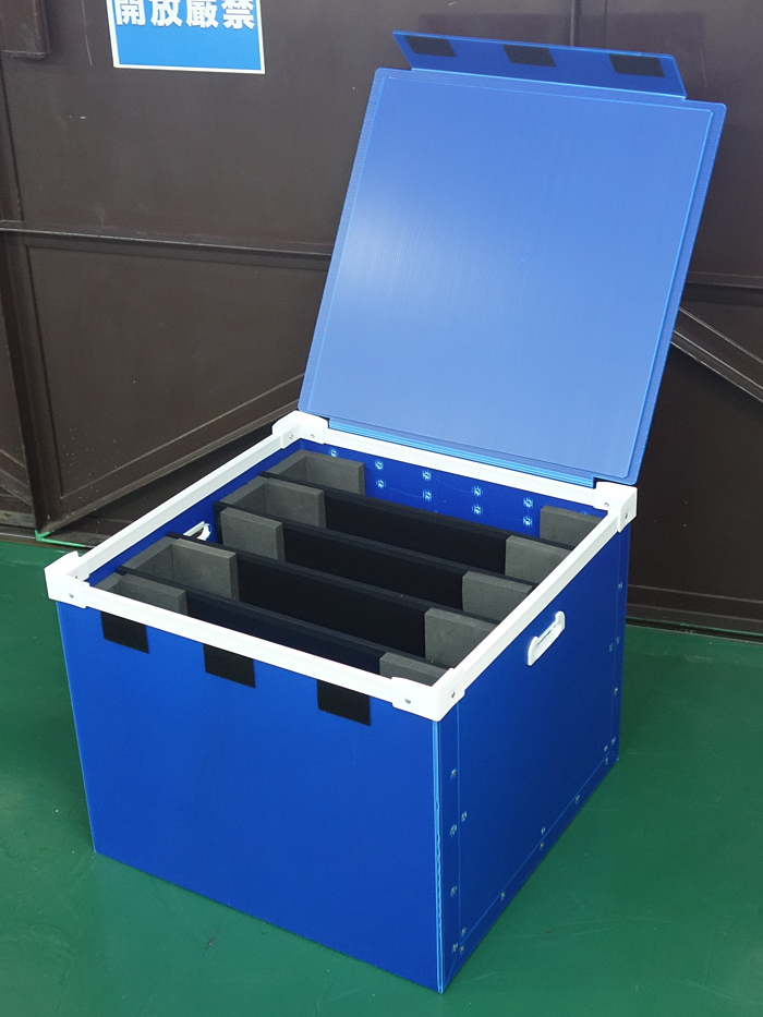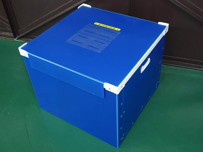 青色のプラダンケース。側面には貫通取手が付いています。 蓋部には「はがせるダン」を貼っているので送り状をきれいに剥がして貼り直せます。