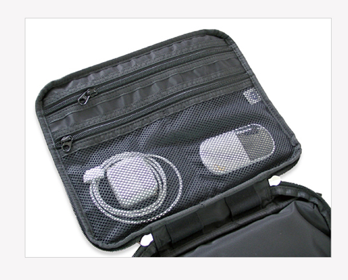 ケース内にはiPad収納部とは別に周辺機器をたっぷり入れられるスペースを設けています。 ACアダプター、充電器、Pocket Wifi、カードリーダー、各種ケーブル類などを収納できます。 このケースにiPad関係の道具一式を収納できるので外出時、家での保管時にとても便利です!!