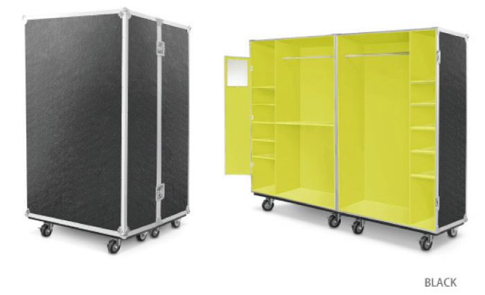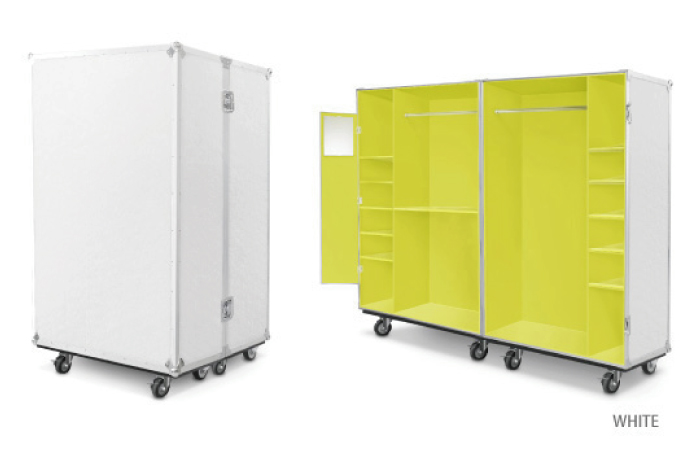 衣装をハンガーにかけたまま収納出来るケースです。 両サイドは棚になっており、靴や鞄、小物などもしっかり整理して収納できます。 内扉には鏡が付いています。 キャスター付きですので、移動も楽に行えます。