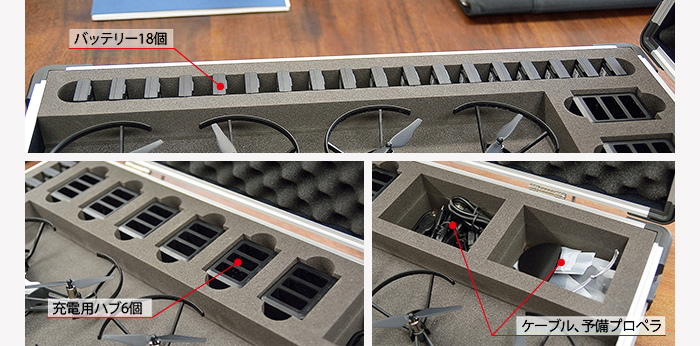 附属品はバッテリー18個、充電用ハブ6個を収納できる場所を作り、本体は3機ずつ2列で収納するようにしました。