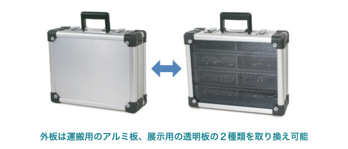 外板は運搬用のアルミ板、展示用の透明板の2種類を取り換え可能。