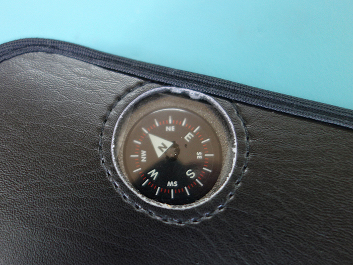 タブレットケース背面の写真です。 ショルダーベルト取付用のDカンが四隅には縫いつけています。 手を通すパッド付のバンドが付いていおり、端末を保持するのが容易になります。