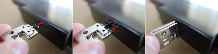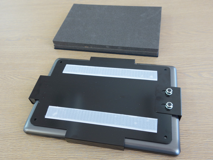 この金具は机の上で使うことを想定しています。 机に傷が付かないように金具の底面にマジックテープで脱着可能なクッション材が付いています。