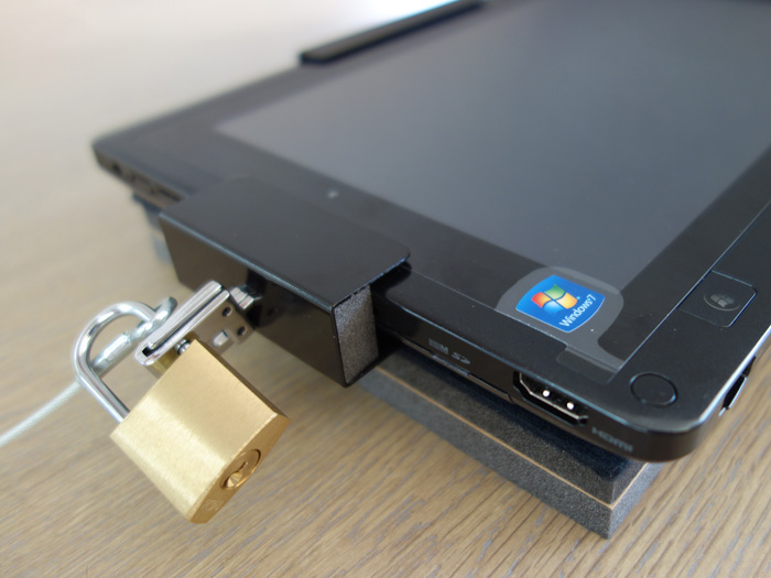 金具側面にセキュリティロックを取り付けるめの穴(セキュリティスロット)が空いています。盗難防止に最適なセキュリティワイヤーを取付けます。