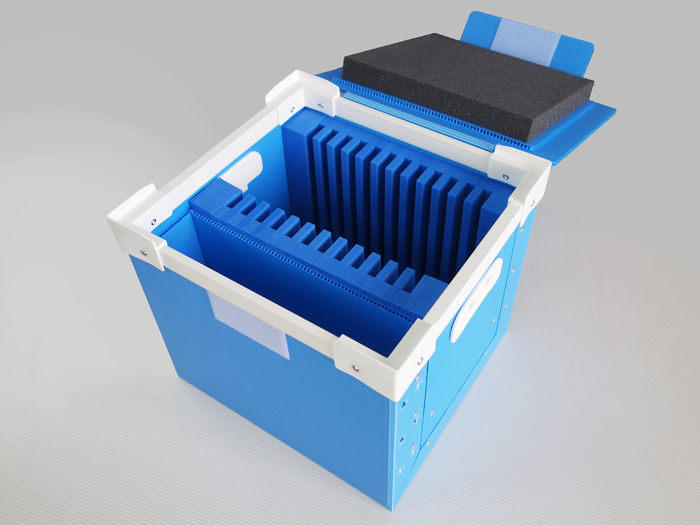 このiPad12台収納プラダンケースは、iPadを12台収納し、その手前の収納スペース上に充電器などの周辺機器を収納することを可能にしました。また、サイドに取っ手をを付けて持ち運びがしやすいように製作しました。