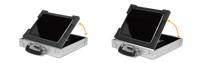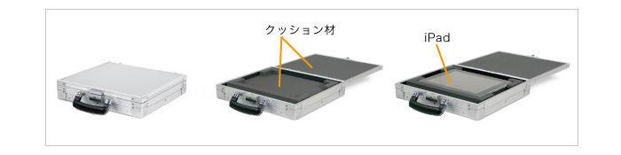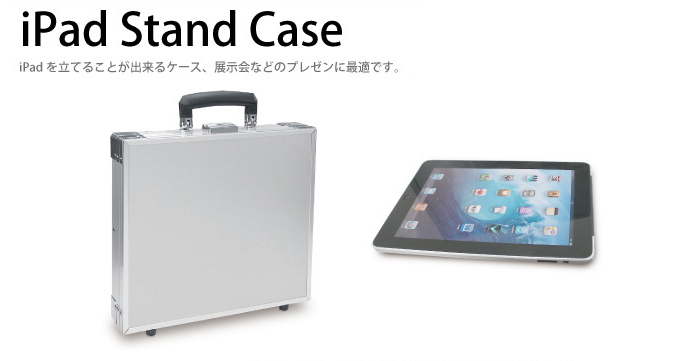 iPadを収納、運搬できるアタッシュケースです。 底に傾斜機構が組み込んであるので、蓋を外してiPadのスタンドとして使う事が出来ます。 展示会などのイベントでのプレゼンに最適なケースです。