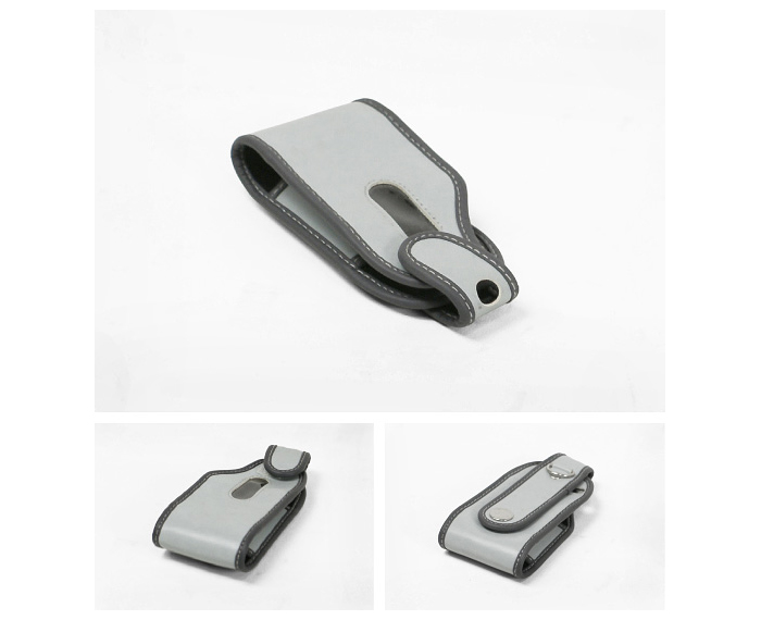 携帯電話用のソフトケースです。 表生地とヘリテープにシルバーの生地を使用しています。 通知液晶用の窓が付いています。 背面にはベルトに引っ掛けるっためのフラップとストラップなどを引っ掛けることが出来るDカンが付いています。