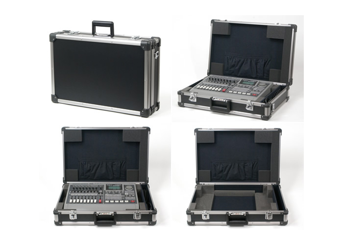 ハードディスク内臓のRoland製MTR収納アルミケース。 ハードディスクが衝撃に弱いため、機器がケース内で動かないよう全面をウレタンで押さえ、また、外部からの衝撃を逃がすよう上下に隙間を設けました。空いたスペースには機器の説明書を収納し、ポケットにはケーブル類が収納できるように設計しました。