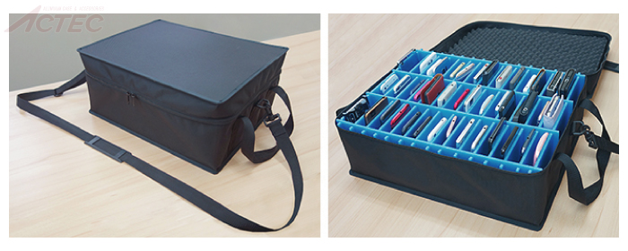 樹脂製の仕切りでソフトケースの中に収納する仕様です。