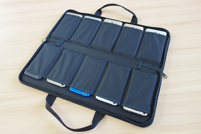 ファスナーを開くと中にスマートフォン収納用のポケットが10個付いています。
