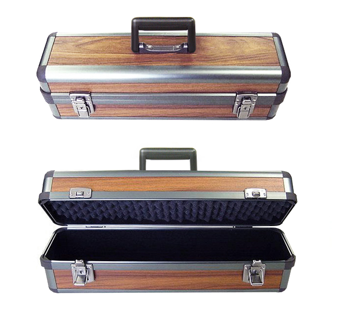 笙(しょう)を収納できるアルミケースです。 アルミケース外観に木目調の板を使用しています。