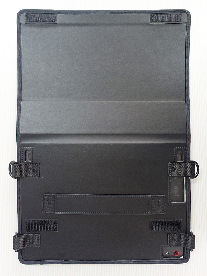 ソフトケース背面の写真です。 ショルダーベルト取付用のDカンが四隅に縫いつけています。 手を通すパッド付のバンドが付いていおり、端末を保持するのが容易になります。