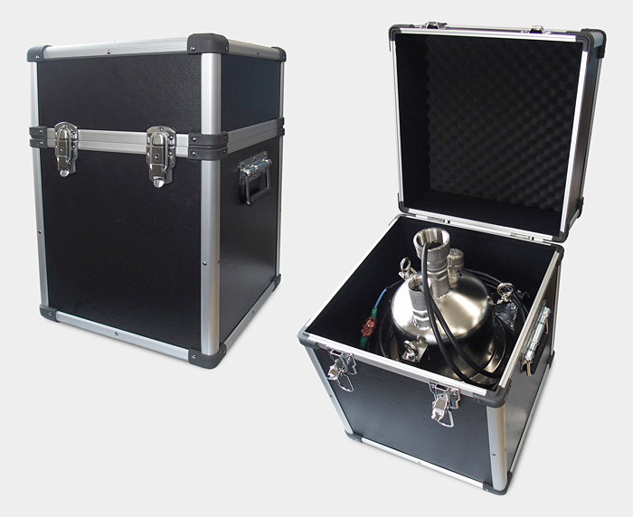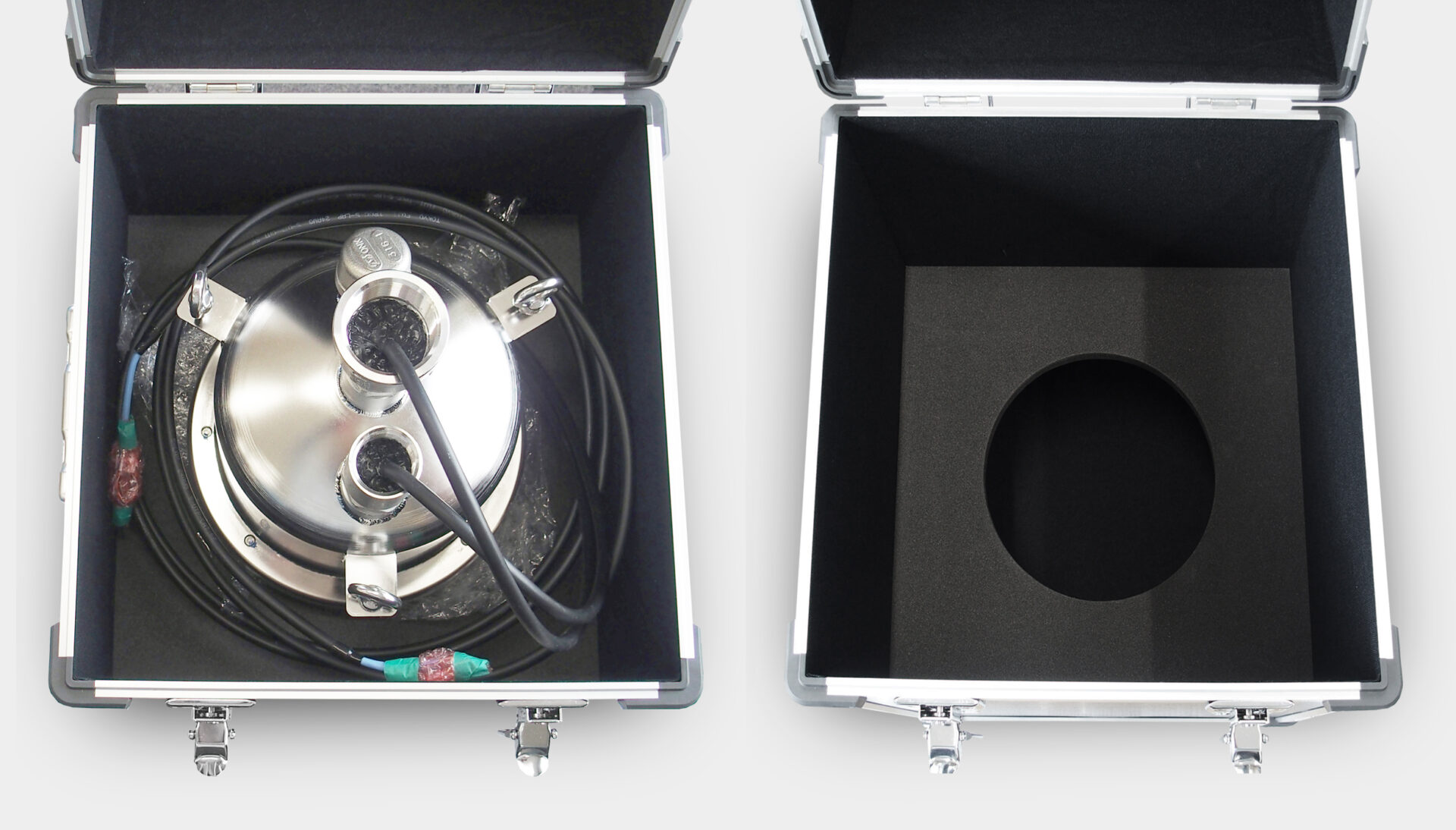 外観はシンプルなケースです。この丸い穴に水中ハウジングを入れて、固定します。また、水中ハウジングに監視カメラを取り付けた状態でケースに収納できるように、ケーブルが収納できるスペースを確保しました。 そして、フタを閉めたときに水中ハウジングが動かないように、フタに波ウレタンを貼っています。 収納物である水中ハウジングの形状は変っていますが、ケースの外観、内装ともにシンプルに仕上げることができました。