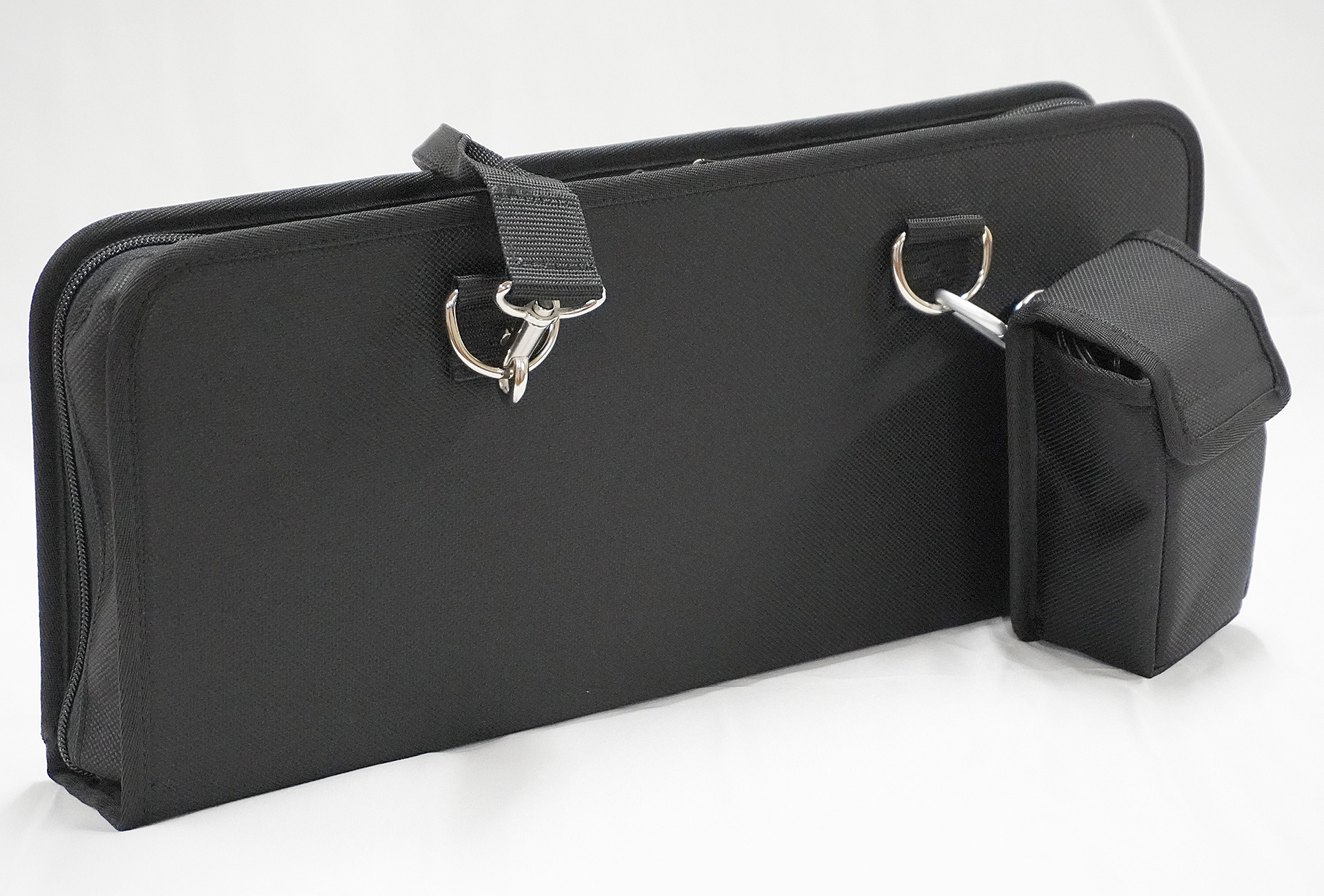 元々、本体自体は薄いので、鍵盤ハーモニカ用のケースの様なサイズのソフトケースに本体を収納する薄型のケースにしました。本体は四隅を内装材で固定できるようにしたことで、持ち運び中にケースの中で動かないようにしています。持ち手は手持ちと肩掛けと2種類の持ち手を取り替えられるように取り付け金具を取り付けました。