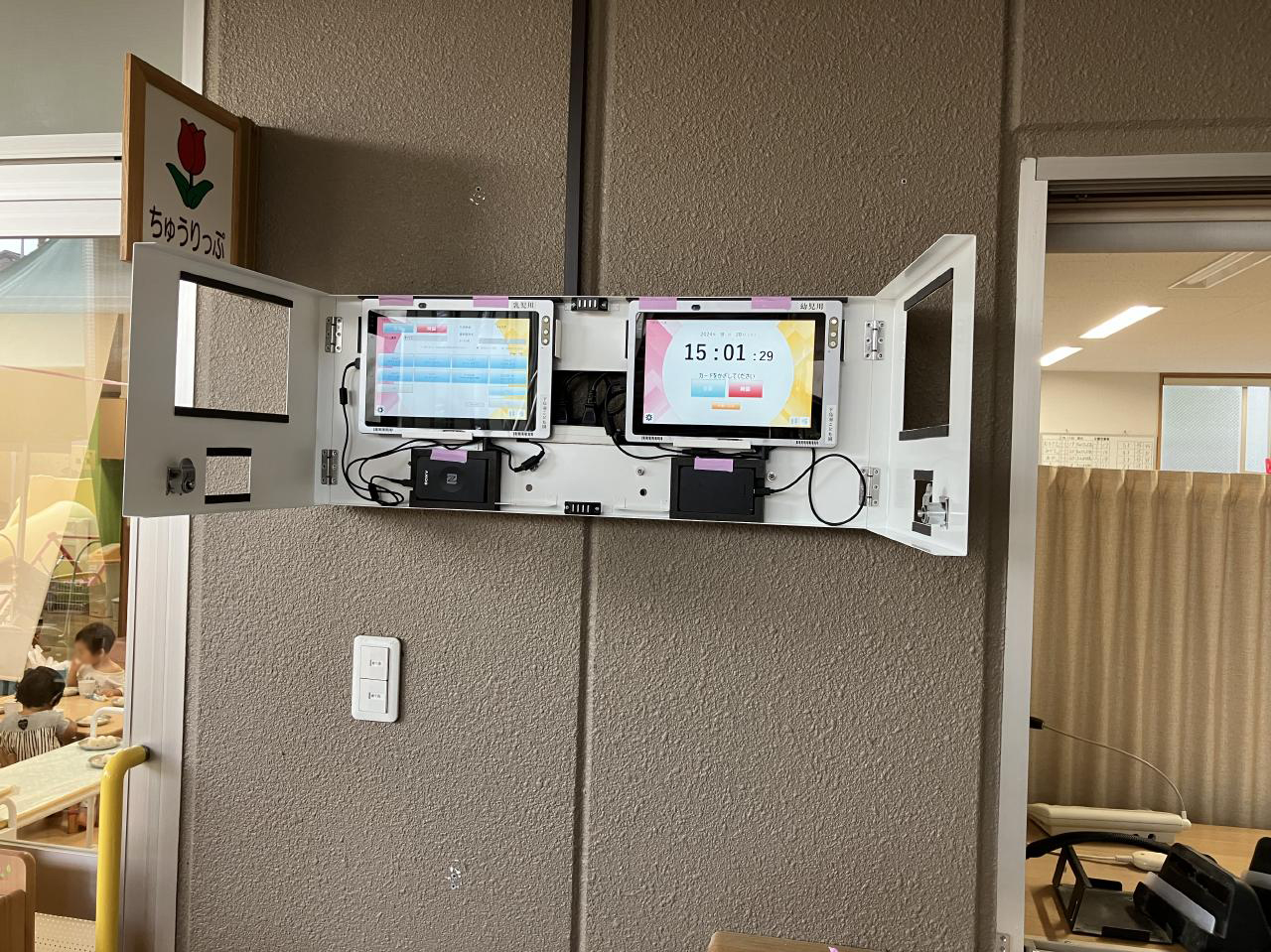 下鳥羽こども園では、登降園管理システムを導入されており、タブレットPCとカードリーダーを園内に置いていたそうですが、子どもの手の届くところに置いてあり、間違って操作したり、落として壊したりしないように、子供の手の届かないところに設置したいという事で、太平工業株式会社に相談されたそうです。