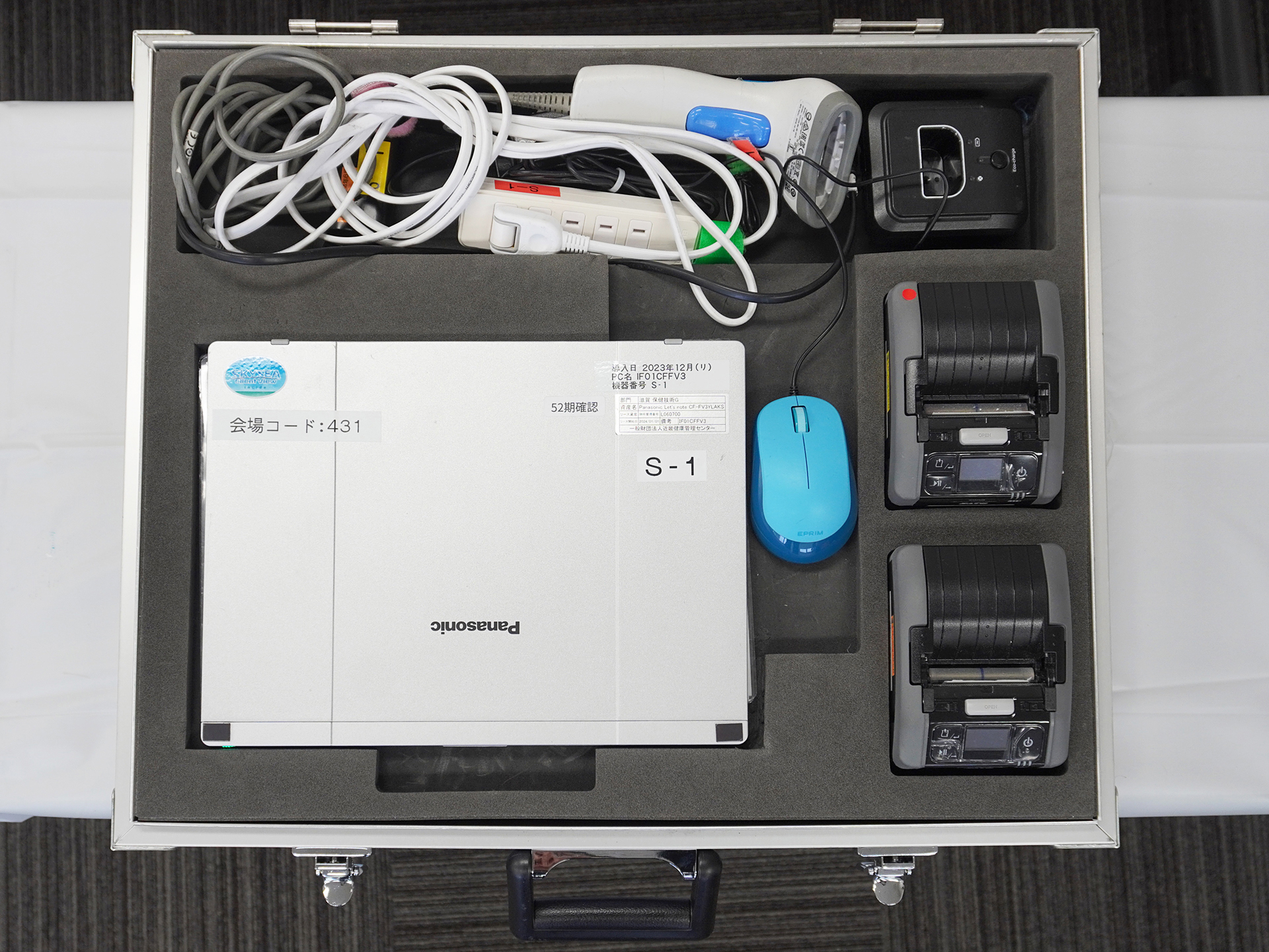 この収納ケースは、機材の安全性はもちろんのこと、現場での取り出しやすさや収納効率も考慮した設計になっており、健康診断業務の効率化に大きく貢献しています。