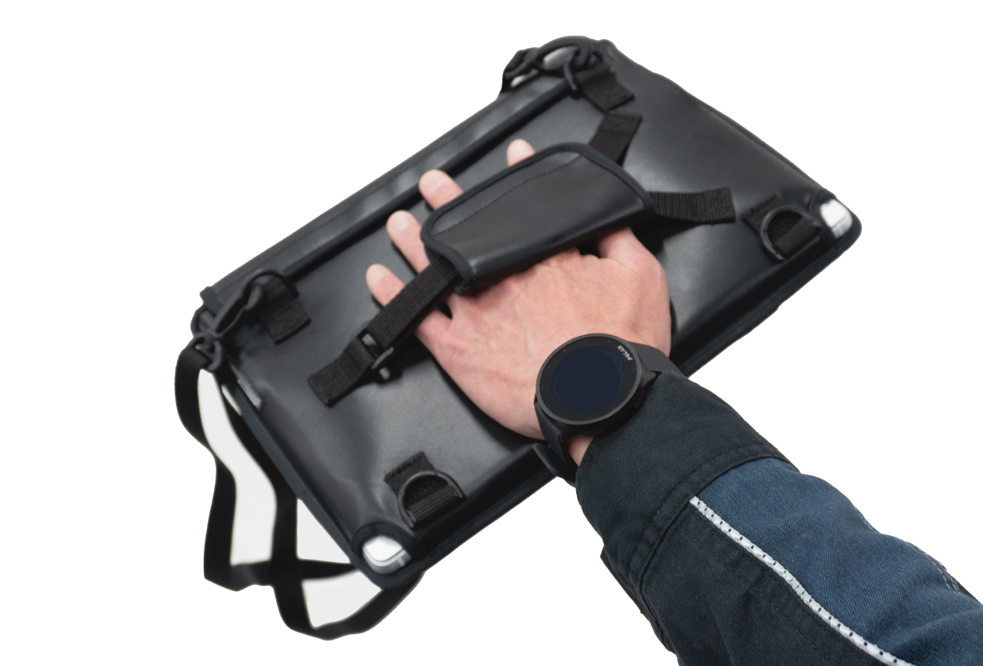 ストラップやハンドベルトを付けることでタブレットの落下を防ぎ、両手が空くことによって作業性と安全性を上げることができます。