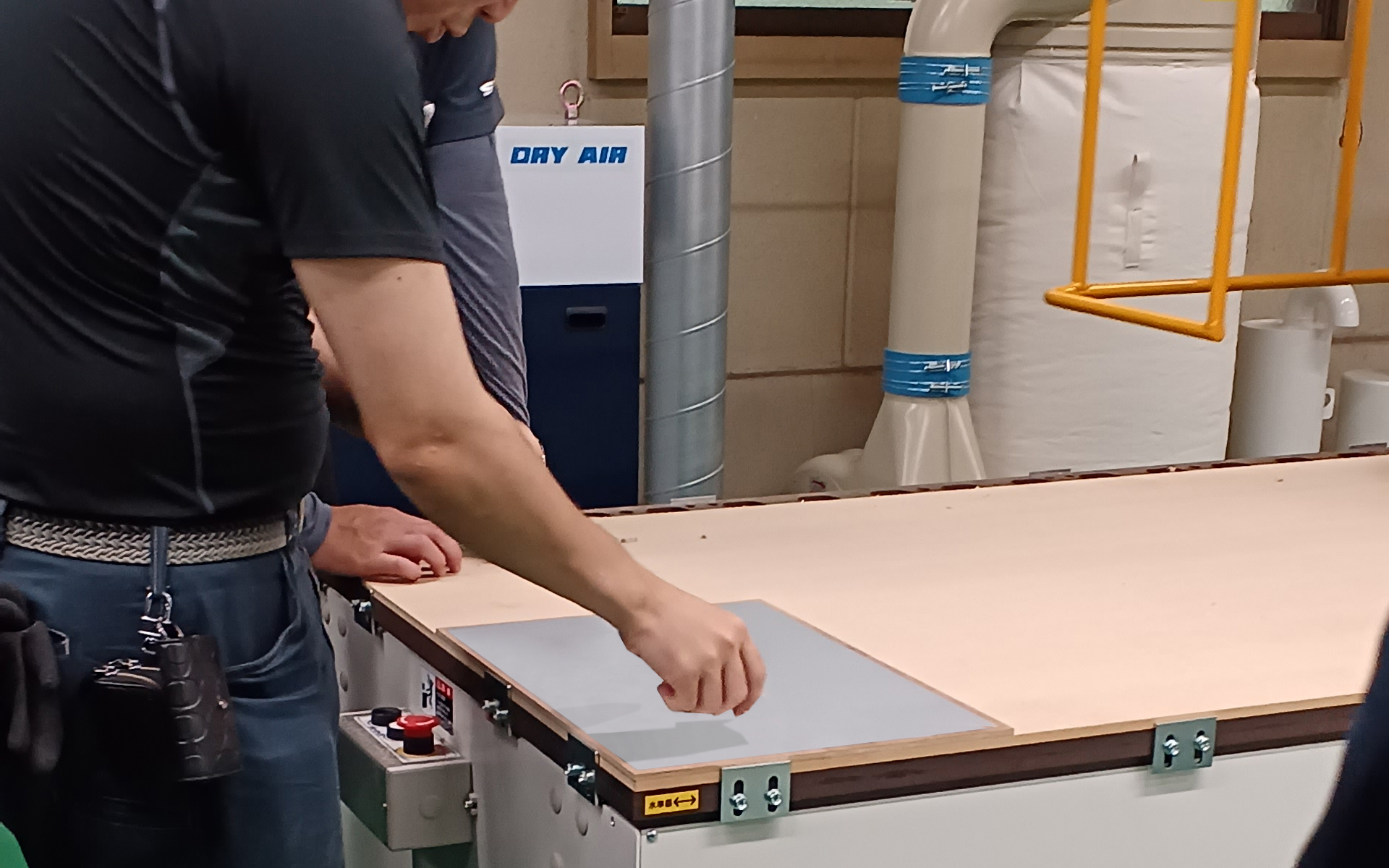 そして、ガントリー型NCルータの台に板材をセットし、セットした位置が正しいか確認を行います。