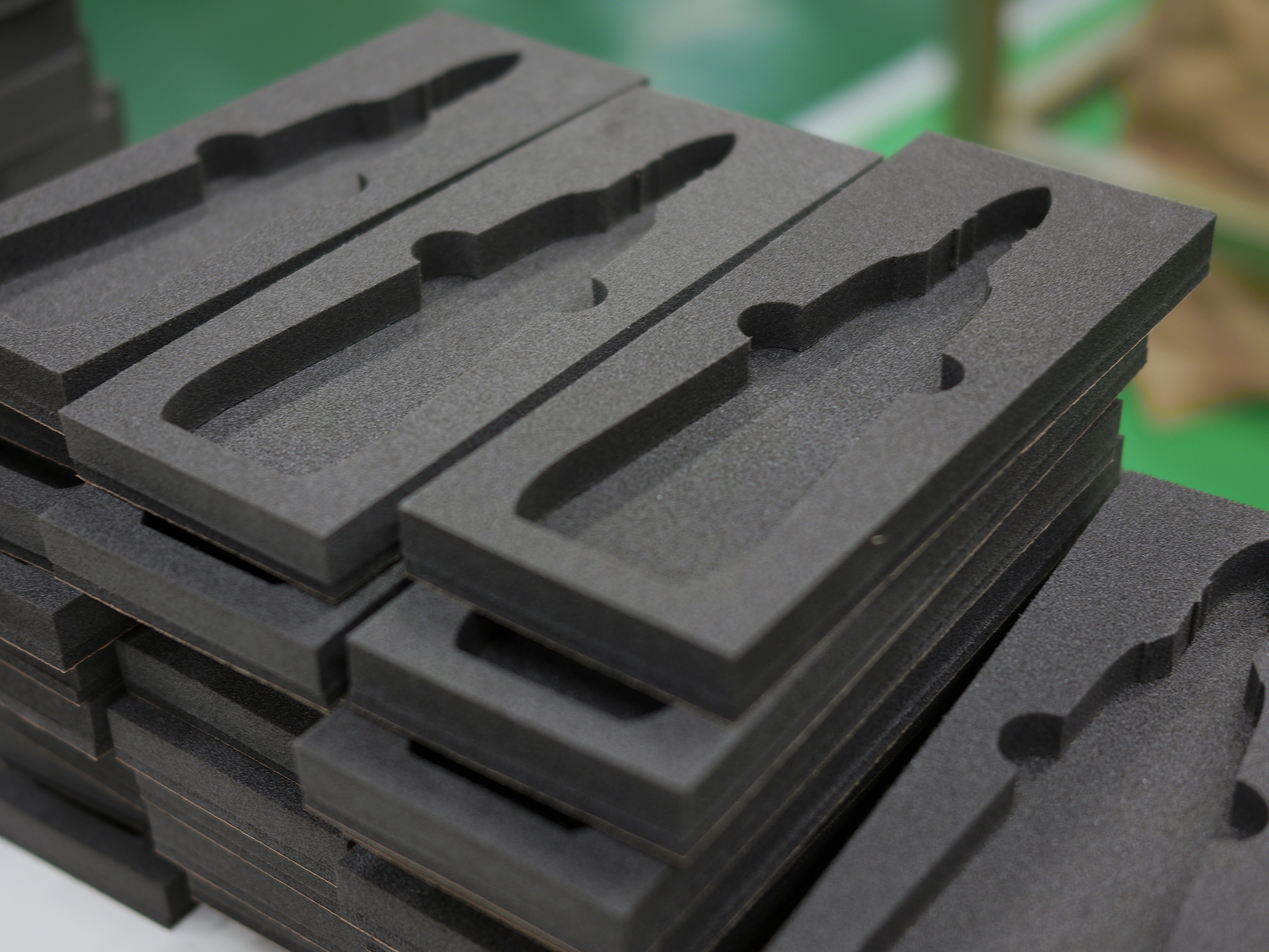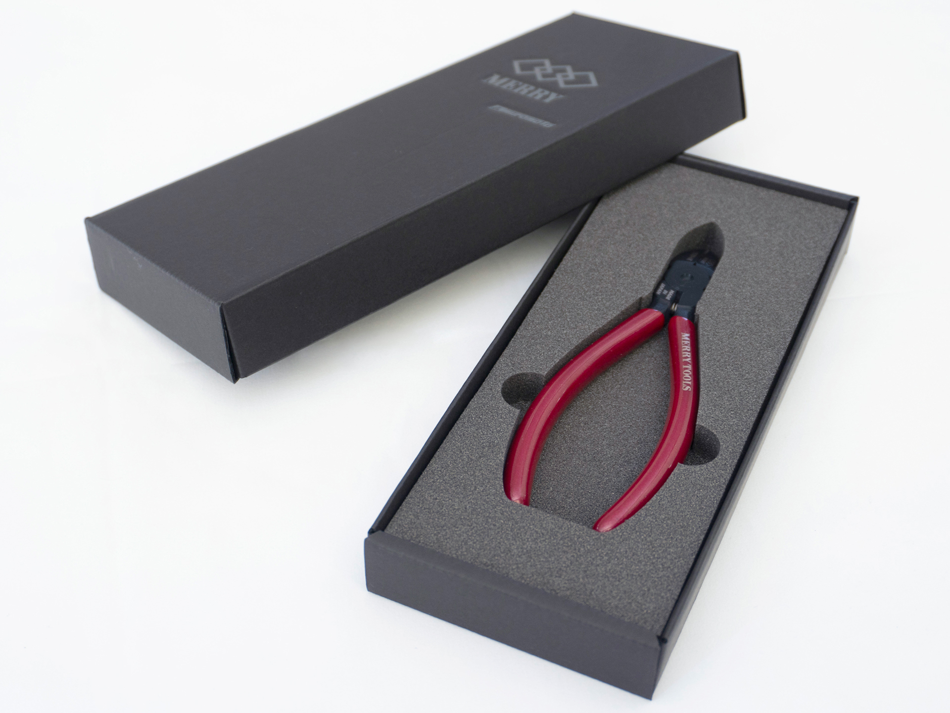 同じ枚方市のふるさと納税返礼品である弊社の「うまい棒ケース」を見て、メリー作業工具の製品梱包用の内装材の加工の相談を頂きました。今回のご依頼としては、返礼品として提供されている特殊コーティングされたメリーのニッパを梱包する箱に入れる内装材の加工でした。
