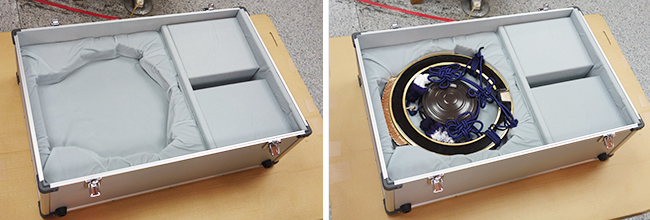 まずケースを開け、柔らかいクッション材に鉦を収納します。 | ||||
